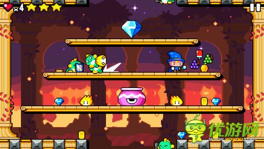 一款像素動作闖關游戲,他為了拯救因詛咒而變成石頭的朋友,玩家只能在屏幕兩邊點擊,使主角進行前后移動,且游戲中沒有跳躍,也就是說,玩家如果想去別的層面只能夠下落到屏幕下面的洞口了。你可以選擇消滅每一層中的所有敵人,來收集金幣和一些能量碎片來提升等級能力。