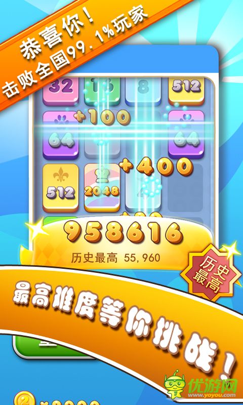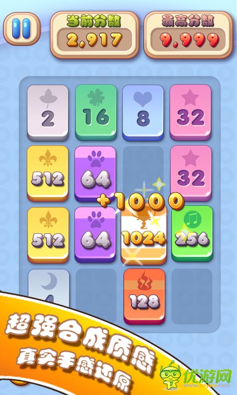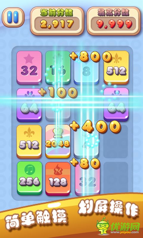 《合成2048》不再是終極目標甚至可以去挑戰(zhàn)4096甚至8192,小伙伴們趕快來加入合成大軍吧!挑戰(zhàn)屬于你自己的《2048》,游戲畫面精美,玩法簡單,讓人愛不釋手,停不下來!