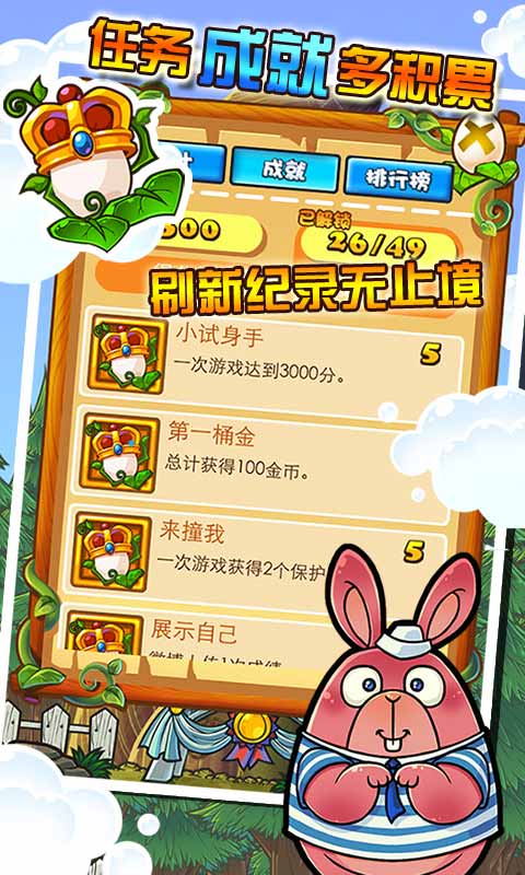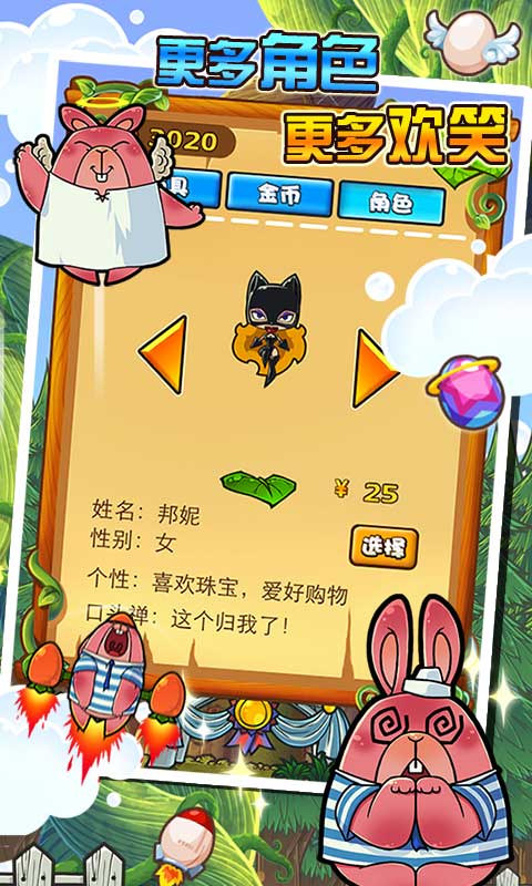 好奇心旺盛的兔子艾吉這回鉆進(jìn)了魔術(shù)師的小丑盒里,再出來(lái)的時(shí)候發(fā)現(xiàn)自己被彈到了一根鉆天的巨藤上。艾吉好奇的想知道巨藤的頂端 有什么,于是勇敢地踩著巨藤的葉片一直向上。當(dāng)心哦艾吉,向上的路途并不輕松。能否在各種蛋的幫助下登上頂端,一切就看你的了!