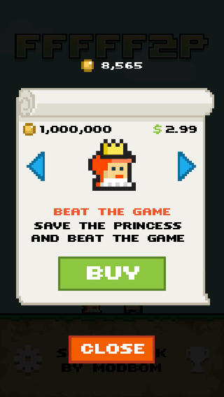 而且游戲的名字與游戲內(nèi)容也有點(diǎn)小諷刺,首先是名字,連續(xù)使用了五個(gè)“F”來強(qiáng)調(diào)游戲是免費(fèi)下載的。如果你細(xì)心觀察,就會(huì)發(fā)現(xiàn)惡魔釋放的方塊上都寫著一些:“Free-to-play”、“Cash-$$$” 等字眼,這就其實(shí)是在諷刺一些游戲,已收費(fèi)為由將游戲的難度設(shè)置得很高,促使玩家消費(fèi)來購買道具。