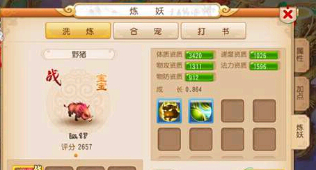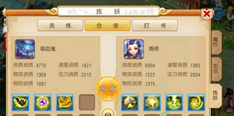 打開煉妖界面可以放入兩只等級無限制的寵物。當然放的寵物越好,合成出來的寶寶也就越好,寶寶都是跟爸媽基因走的。所以想要極品的話,首先就要洗個好資質(zhì)的爸媽再合成喲。如果寶寶和寶寶合會繼承百分百的寶寶屬性,如果寶寶和野生合成就會取百分40的野生屬性和百分60的寶寶屬性。言下之意就是說會差很遠,所以最好還是用寶寶和寶寶合寵。