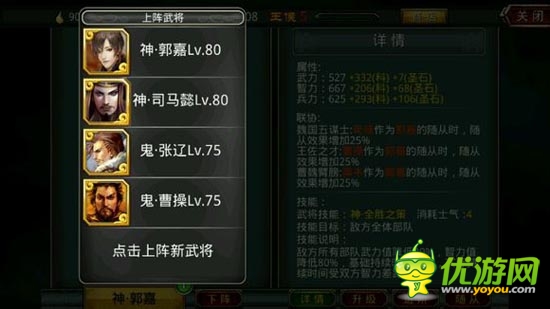 技能釋放順序是郭嘉司馬齊開(kāi),然后張遼。此時(shí)一般戰(zhàn)斗都已結(jié)束,如果沒(méi)有,放郭嘉或曹操。