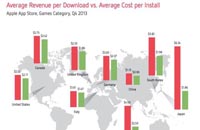 據(jù)國(guó)外Chartboost發(fā)布的2013年第四季度Distimo調(diào)查報(bào)告中顯示:中國(guó)大陸地區(qū)移動(dòng)游戲的CPI(Cost Per Install即:每新安裝應(yīng)用所需成本)及平均營(yíng)收值均低于全球其他地區(qū)。