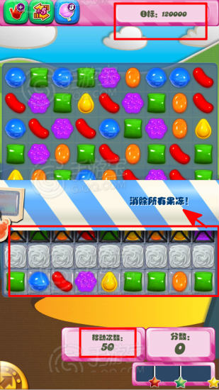 第25關(guān)的通關(guān)要求是在50步之內(nèi)消除所有果凍,分?jǐn)?shù)達(dá)到12W。