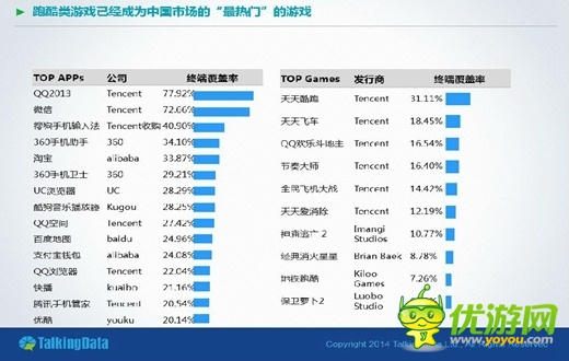 而在這些休閑類游戲中,跑酷類游戲已經(jīng)成為中國市場的“最熱門”的游戲。根據(jù)TalkingData數(shù)據(jù):QQ終端覆蓋率為77.92%,微信為72.66%,基本所有人都安裝了QQ或微信,中國TOP15的應(yīng)用都有超過20%的用戶覆蓋度。另外,騰訊的休閑游戲《天天酷跑》終端覆蓋率為 31.11%,遠遠領(lǐng)跑于第二位的《天天飛車》。