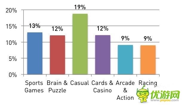 我們主要分析了以下六個細分類:體育類、益智類、休閑類、棋牌&類、動作冒險類以及競速類。
