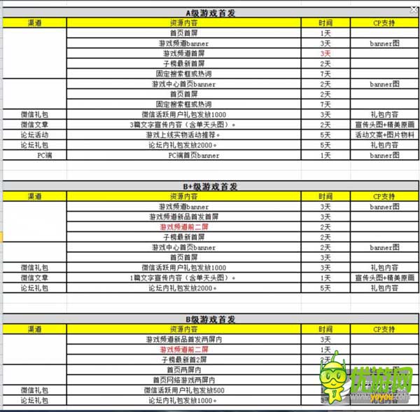 “首發(fā)”指的是第一次與用戶正式見面,在手游中的“首發(fā)”通常分為游戲正式上線或大規(guī)模對外測試兩種情況。首發(fā)對手游CP和渠道都有非凡的意義。CP希望盡可能多的渠道首發(fā),但受限于SDK接入(一個SDK有經(jīng)驗的技術(shù)需要2-3天,沒經(jīng)驗的要5天),一般能同時上15家渠道首發(fā)就已經(jīng)算很厲害。另一方面,渠道對內(nèi)容把控漸嚴,只有優(yōu)質(zhì)產(chǎn)品(B級以上)才有獲得首發(fā)資源推薦,而一些A、S產(chǎn)品的首發(fā)更是渠道爭搶的對象,如果某個大渠道缺少重量級產(chǎn)品首發(fā)或是下載,其用戶可能就會因此而流失。