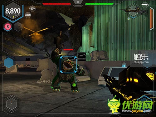《2》選擇的就是砍掉射擊這一步。玩家只需要使用左邊的屏幕區(qū)域移動,右邊的屏幕區(qū)域瞄準(zhǔn),敵人處在準(zhǔn)心里并且在射程內(nèi),就會自動射擊。這一簡化了操作,但是也有其弊端:玩家沒有辦法控制射擊的節(jié)奏,也就是玩家的策略選擇和彈藥控制都會很局促。