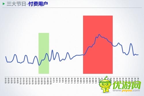 幾次節(jié)日的新增占比增長都發(fā)生在節(jié)日之前,在圣誕節(jié)前10天很多CP就開始做大力的推廣,比如積分墻,一些廣告等,春節(jié)期間的推廣占比也是挺高的,新增的高峰期出現(xiàn)在1月23號到29號(臘月二十九日)之間,再往后推廣人員也放假了,但發(fā)現(xiàn)這是一個滯后的效應,你做了推廣,活躍用戶是滯后出現(xiàn)的。