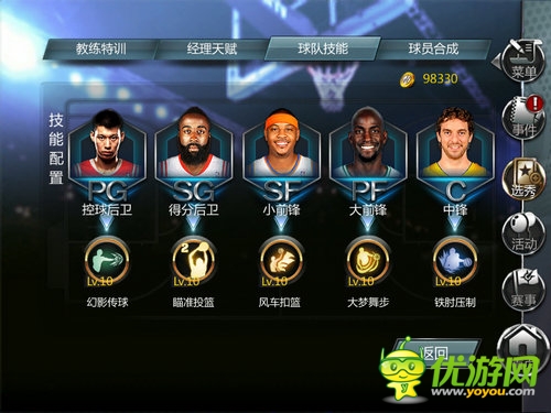 【球隊技能】經(jīng)理天賦有對應(yīng)的天賦類強化球隊技能,因此,玩家可根據(jù)所選“經(jīng)理天賦”提升重要技能,滿級10級,并配置于相應(yīng)的陣容位置上。比如,小編在經(jīng)理天賦中選擇“內(nèi)線強攻”路線,那么在技能培養(yǎng)方面,小編會選擇先提升“進攻技能”下的“風(fēng)車扣籃”、“瞄準投籃”等內(nèi)線技能,并配置于SF、SG位置。
