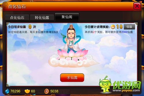 前往聚仙閣祈求觀音姐姐灑幾滴仙露亦是每日必做的功課。俗活說(shuō):“心誠(chéng)則靈”,如果玩家滿懷真誠(chéng)祈求,觀音姐姐一定不會(huì)吝嗇給笑臉的。當(dāng)然,如果當(dāng)日運(yùn)氣欠佳或恰逢觀音姐姐情緒低落,也可通過(guò)“逆天改運(yùn)”強(qiáng)勢(shì)扭轉(zhuǎn)慘淡局面,出現(xiàn)全部笑臉的可能性亦不低哦。如果玩家闖過(guò)了10層通天塔,每日求仙露的次數(shù)就可增加至6次。仙露多多益善,所以快去爬塔吧!
