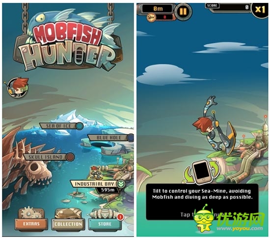 游戲每次挑戰(zhàn)基本分做兩個(gè)階段,在剛開始游戲內(nèi)角色會(huì)把潛水彈往海里丟,這時(shí)玩家就要透過左右移動(dòng)手機(jī)操作潛水彈閃開魚群,盡可能地往海底最深處探索。