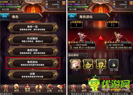 有高星潛質(zhì)的低星卡可通過“角色進(jìn)化”來提升星級(jí),進(jìn)化后角色增加一星級(jí),等級(jí)、裝備、潛能保留而必殺技將重置為L(zhǎng)v.1級(jí)。進(jìn)行角色進(jìn)化有一系列必要條件需滿足,首先角色進(jìn)行升星之前需要先將界限滿破,并達(dá)到等級(jí)滿級(jí),而后還需擁有進(jìn)化所需的所有素材。當(dāng)升星條件未滿足時(shí),進(jìn)化界面將有所提示。