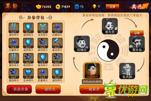 游戲中,當(dāng)玩家等級(jí)達(dá)到一定要求時(shí),即可解鎖算卦系統(tǒng)。玩家可消耗少量銅錢,從江湖術(shù)士、百曉生等算卦師中選擇一位一鍵算卦。等級(jí)越高可獲得高級(jí)卦象的幾率就越大,使用一些元寶召喚黃半仙或傳奇人物張?zhí)鞄煟纯纱蠓嵘龈呒?jí)卦象的概率,并將免費(fèi)獲得一枚罕見的太極卦象,可轉(zhuǎn)換為高達(dá)2500的卦象經(jīng)驗(yàn),是日常轉(zhuǎn)化卦象碎片所不能匹敵的。