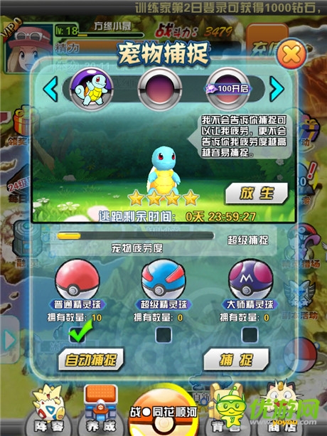 用精靈球?qū)⒆サ降膶櫸镎{(diào)戲的疲勞度足夠高,這個和消耗的精靈球有關(guān),如果將疲勞度提升到100%,則會觸發(fā)超級捕捉,無論多高星級的寵物,捕捉都會成功,那份成就感,不是從扭蛋中得到寵物可以比的。只是“超級捕捉”的觸發(fā),真是要消耗很多精靈球啊,多打怪做任務(wù)積攢吧。我的第一個超級捕捉就是這么達(dá)成的。