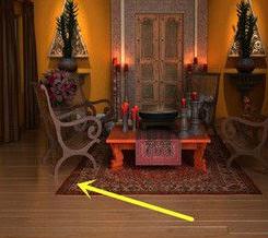 9.此時掀開地上的地毯,在地毯上可以看到一個密碼器,先點(diǎn)擊圖中紅色方框那個按鈕,接下去每點(diǎn)擊一個按鈕下一個按鈕就會發(fā)光(例如先點(diǎn)擊紅色,黃色格子發(fā)光,此時再點(diǎn)擊黃色,另一個顏色又會發(fā)光,以此類推),按照順序依次點(diǎn)過去即可,打開密碼器就可以拿到鑰匙的另一部分。