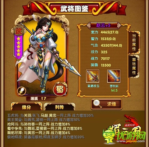 蜀漢五虎將:關(guān)羽、張飛、趙云、馬超、黃忠,其中橙將張飛要通過活動(dòng)黎明酒館招募,獲得會(huì)相對費(fèi)勁點(diǎn)兒,其余幾人都比較容易。五人一同上陣戰(zhàn)力加成25%/35%,除了五虎將的特有緣分加成,每個(gè)人與其他眾多武將、裝備都有較高的戰(zhàn)力加成,搭配多元化。五人中,輸出型3人、肉盾型1人、控制性1人,所具備的技能天地?zé)o用、咆哮、羅剎斬、元靈神盾、噤若寒蟬在戰(zhàn)場上的殺傷力都是極強(qiáng)的。下面我們就通過圖鑒來了解下五虎將各自的數(shù)值和緣分搭配吧。