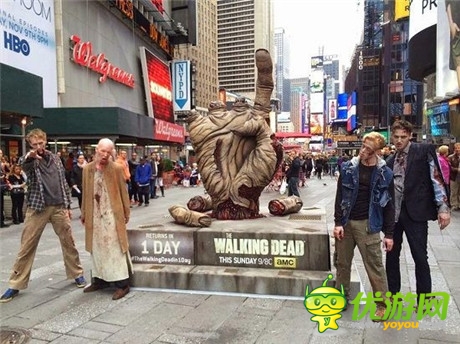 新一輪的感官刺激再次上演,人氣美劇《行尸走肉(The Walking Dead)》第五季終于亮相了,與此同時,制片方也在美國紐約時代廣場上展開了相關(guān)的活動,別以為這些“僵尸”只會在熒幕里露臉,為了給電視劇造勢,僵尸們早早地就開始賣力地在大街上“工作”了(要是上班吃著八分堡突然看到這貨會不會被嚇到)。