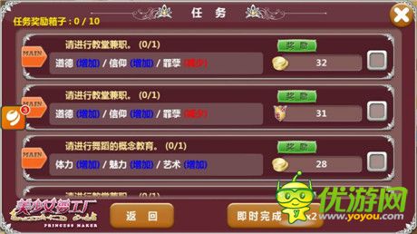任務(wù):在這里可以查看到玩家為女兒制定的職業(yè)意向下,女兒應(yīng)該完成哪些任務(wù),建議新手玩家先參考任務(wù)內(nèi)容,再為女兒安排日程。