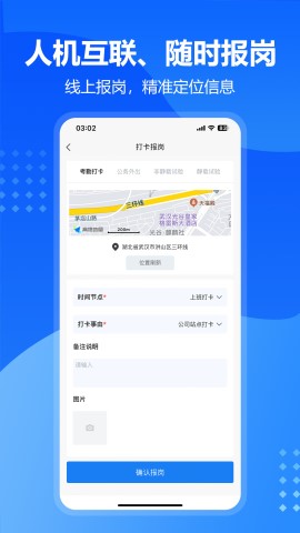 1.員工報崗與考勤:員工可以通過手機APP或PC端在線填寫個人崗位信息,包括姓名、工號、部門、崗位、工作時間等,并支持圖片上傳以增強數(shù)據(jù)可信度。