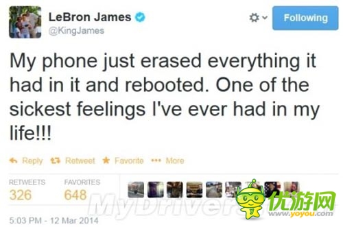 早前,三星聘請了NBA球星“小皇帝”詹姆斯為自家Galaxy Note 2手機(jī)代言。令人大跌眼鏡的是,日前這位直爽的代言人居然在Twitter上吐槽,“自己的手機(jī)把所有東西都刪掉了,并且開始重啟。這真是這輩子遇到最糟糕的事情”。